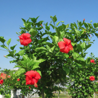 Цветки гибискуса ярко-карминного или красного цвета, довольно крупные, формирующиеся на побегах текущего года.